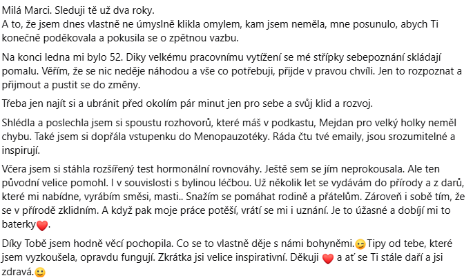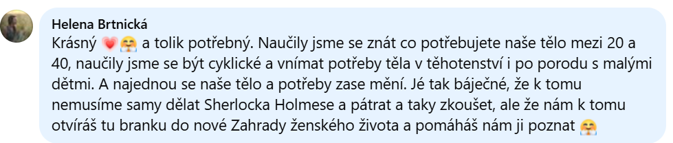 Pro mě byla velmi silná ta hloubka, to bylo velmi inspirující. A hloubka procesu menopauzy, já ji měla spojenou hlavně s fyzickými příznaky, takže ten opravdu až alchymistický přerod v královnu, když se zadaří, je neuvěřitelný.