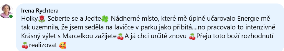 Byla jsem dojatá a silně zasažená takovou krásnou ženskou silou, obrovskou otevřeností, sounáležitostí, sdílením, moudrostí, hloubkou a opravdovostí. Mnohokrát jsem vnímala, jak vše promlouvá k něčemu hluboko ve mně a po celou dobu jsem cítila překrásnou a vzácnou, výjimečnou energii, která ke mně proudila. Moc děkuji.
